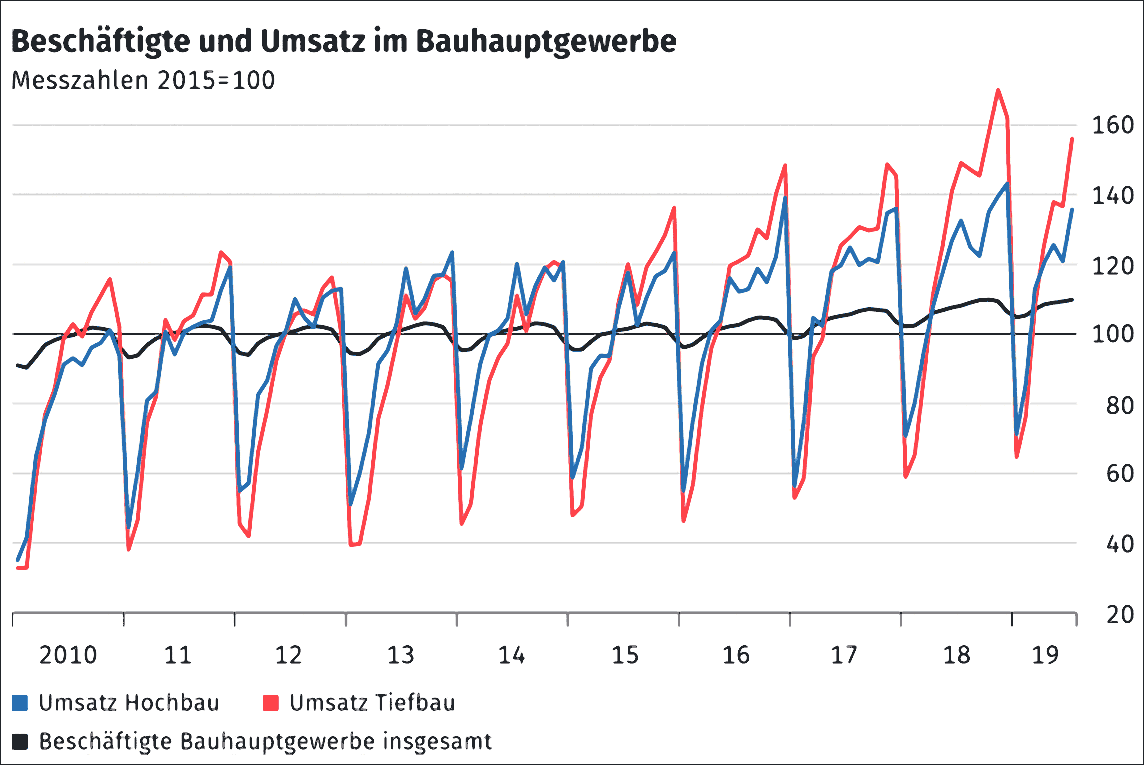 Deutliche Umsatzzuwächse im BauhauptgewerbeWie das Statistische Bundesamt auf Basis vorläufiger Zahlen gerade mitgeteilt hat, lagen im Juli 2019 die Umsätze im Bauhauptgewerbe um 5,6% höher als im Juli 2018, und die Zahl der Beschäftigten stieg um 1,6% gegenüber dem Vorjahresmonat.In den ersten sieben Monaten 2019 stieg der Umsatz im Bauhauptgewerbe im Vergleich zum entsprechenden Vorjahreszeitraum um 7,7 %. Die Zahl der Beschäftigten erhöhte sich im gleichen Zeitraum um 2,3 %.