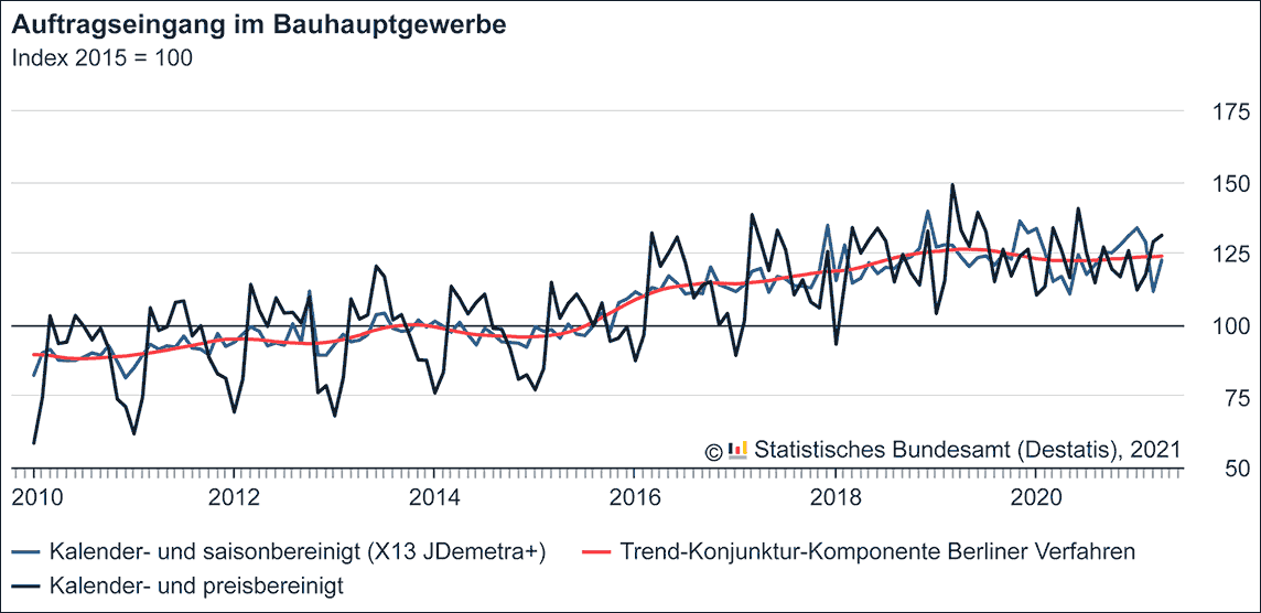 Nominal der höchste Auftragseingang in einem AprilDer reale (preisbereinigte) Auftragseingang im Bauhauptgewerbe war nach Angaben des Statistischen Bundesamtesim April 2021 saison- und kalenderbereinigt 9,8% höher als im März 2021. Im Vergleich zum April 2020 war der reale, kalenderbereinigte Auftragseingang im April um 4,1% höher. In den ersten vier Monaten des Jahres 2021 stiegen die realen Auftragseingänge gegenüber dem Vorjahreszeitraum um 1,2%.