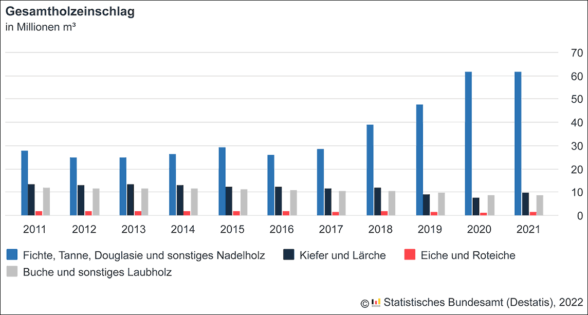 Neuer Rekordwert beim Holzeinschlag 20212021 wurden in deutschen Wäldern 83,0 Mio. m³ Holz eingeschlagen. Wie das Statistische Bundesamt mitgeteilt hat, stieg der Holzeinschlag damit gegenüber dem bisherigen Höchstwert von 80,4 Mio. m³ im Jahr 2020 noch einmal um 3,2%. Rückläufig war dagegen der Holzeinschlag aufgrund von Waldschäden. Er sank gegenüber dem Höchstwert aus dem Vorjahr von 60,1 Mio. m³ zwar um 16,0% auf 50,5 Mio. m³ im Jahr 2021, bewegte sich aber weiter auf hohem Niveau.